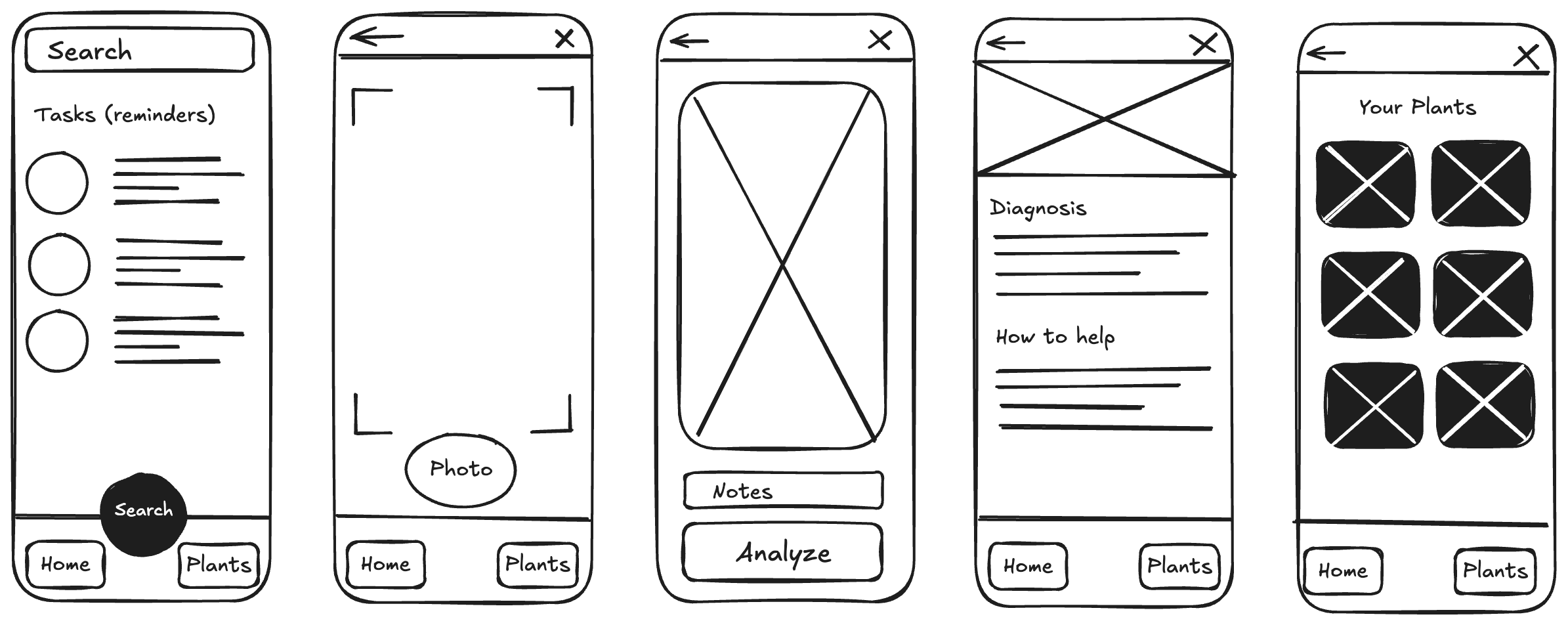 When creating paper wireframes for the plant diagnosis app, my goal was to visualize a simple, intuitive layout that would make diagnosing and caring for plants effortless. Starting on paper allowed me to quickly explore various layout ideas, focusing on how users would interact with each screen and navigate through the app without getting bogged down by details too early in the process.