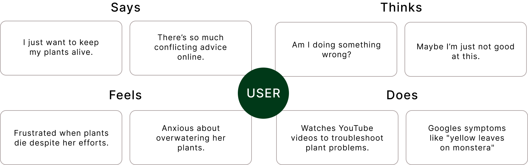 For the user research, I conducted one-on-one interviews with 5 plant owners to identify common challenges in plant care. Initially, I assumed that users mainly struggled with watering and basic plant maintenance, but the research revealed a broader range of issues, including plant diseases, pests, and difficulty in diagnosing specific plant health problems. Participants also expressed frustration with the lack of reliable, accessible plant care resources.
